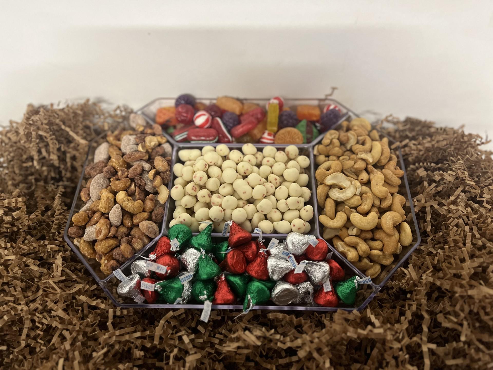 A festive tray with a variety of Christmas themed goodies including salted cashews, glazed mixed nuts, sugar cookie bites, Filled hard candy, and holiday Hershey Kisses. A great crowd pleaser at parties!