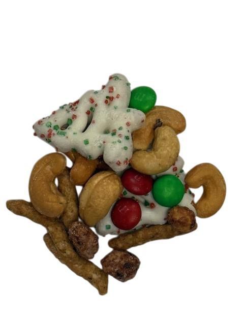Butter toasted peanuts, roasted salted whole cashews, salted sesame sticks, red and green M&Ms, White chocolate Christmas tree pretzels. Packaged in the same facility as peanuts, tree nuts, wheat, soy, and milk products. |