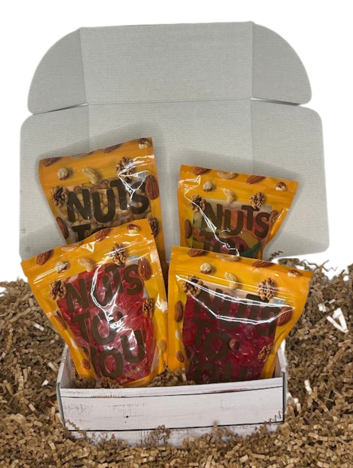 If you know someone with a sweet tooth, this is perfect for them! Strawberry laces, wild cherry gummy bears, large assorted Swedish fish, and honey roasted peanuts are sure to satisfy that sweet craving for anyone!
