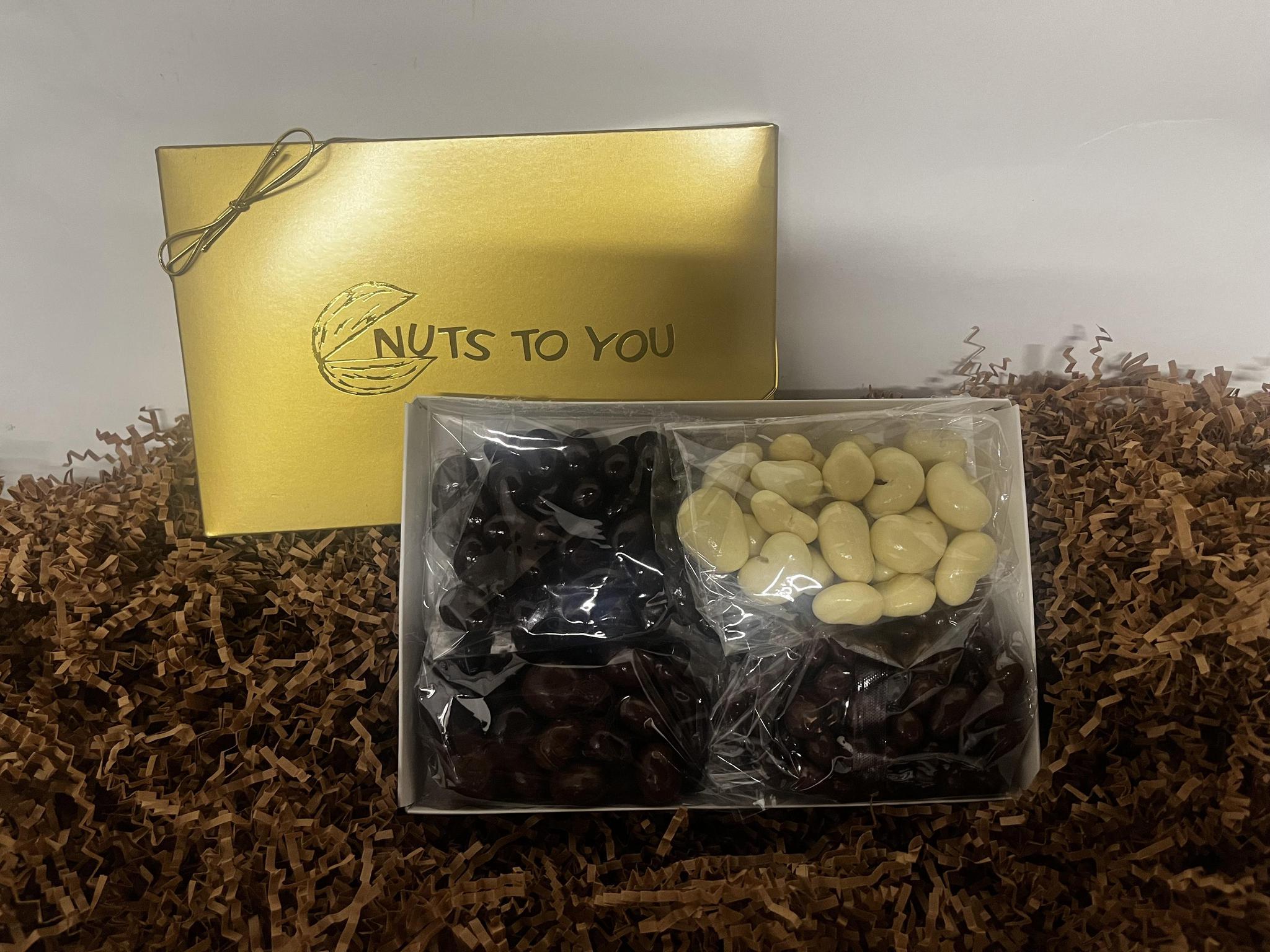 72% Dark Almonds, White Toffee Cashews, Milk and Dark Bridge Mix, and Milk and Dark Sea Salt Caramels in a simple yet elegant gift box is the perfect gift for anyone. .4 lbs of each product