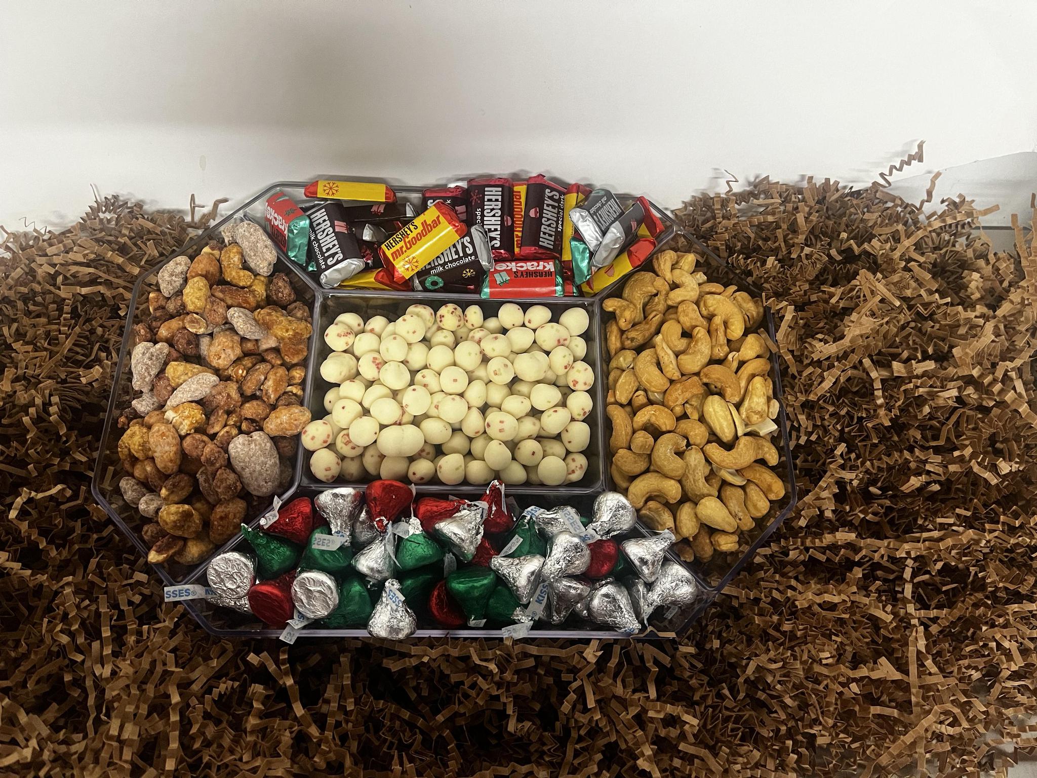 A festive tray with a variety of Christmas themed goodies including salted cashews, glazed mixed nuts, sugar cookie bites, Hershey's miniatures, and holiday Hershey Kisses. A great crowd pleaser at parties!