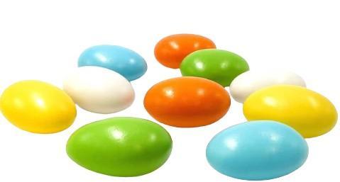 Multi colored candy coated almonds. These pastel beauties are lightly roasted before being covered in their decadent shells. There are approximately 110 almonds per lb.