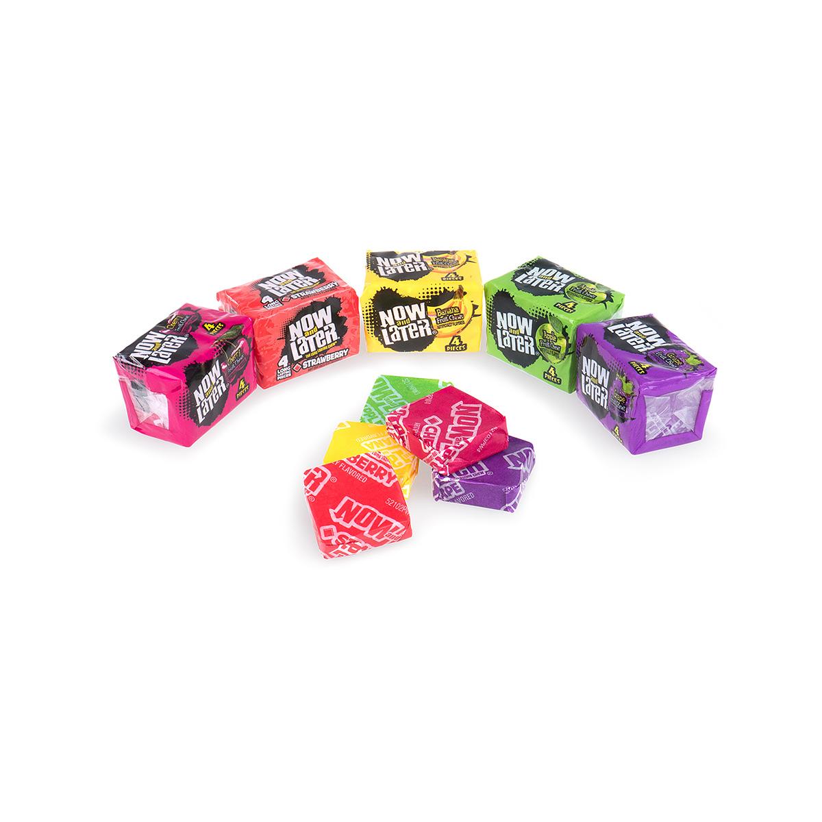 An old-time favorite, fruity-flavored Now and Laters start off harder, then turn into soft, chewy candy.