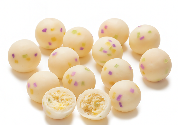 Vanilla cookie center wrapped in smooth sugar cookie flavored coating and a sprinkle of pink, green, yellow & purple sugar.